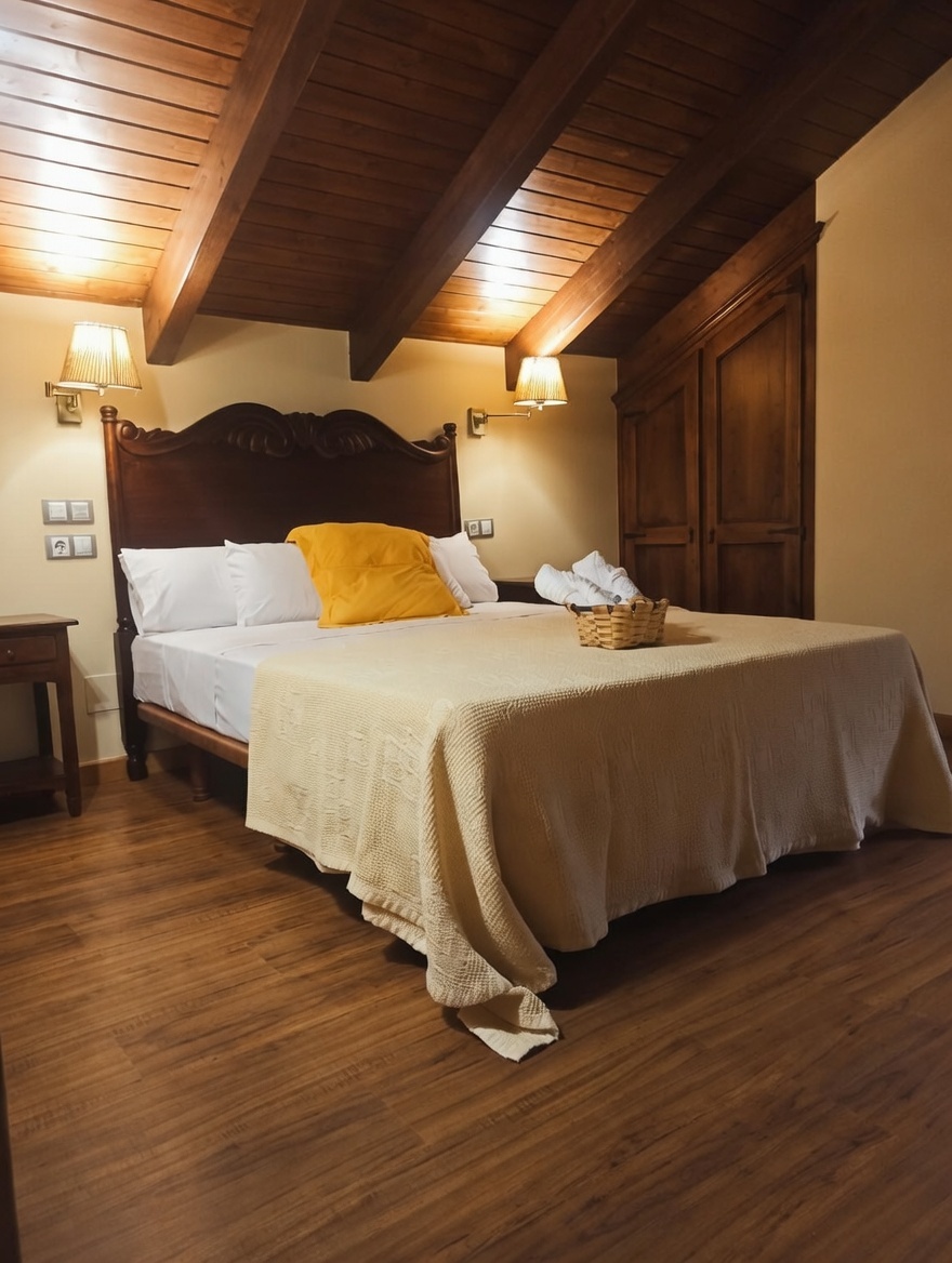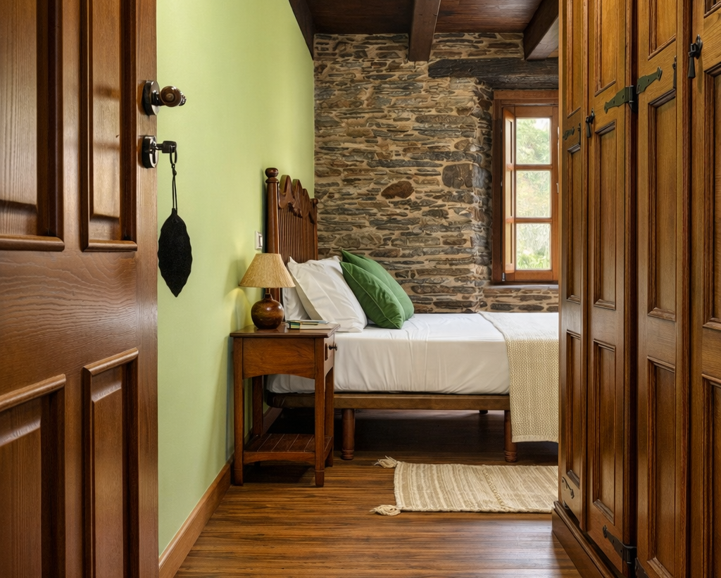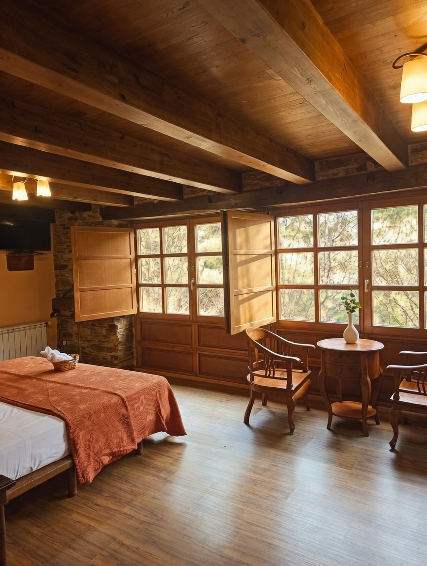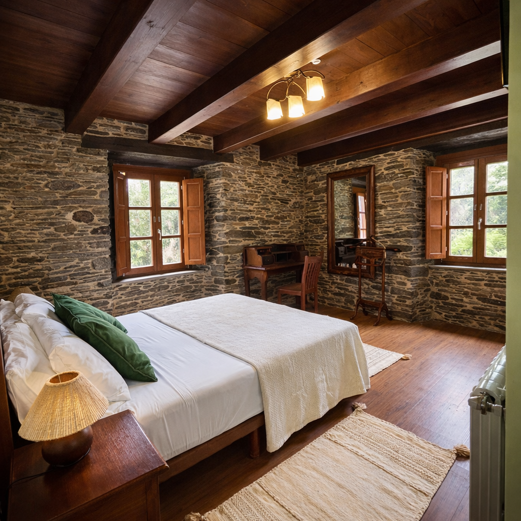 Nuestras nueve habitaciones combinan la calidez rústica con la belleza natural del entorno, ofreciendo un refugio de descanso único, donde despertarse con el suave murmullo del río Das Reigadas es parte de la experiencia.